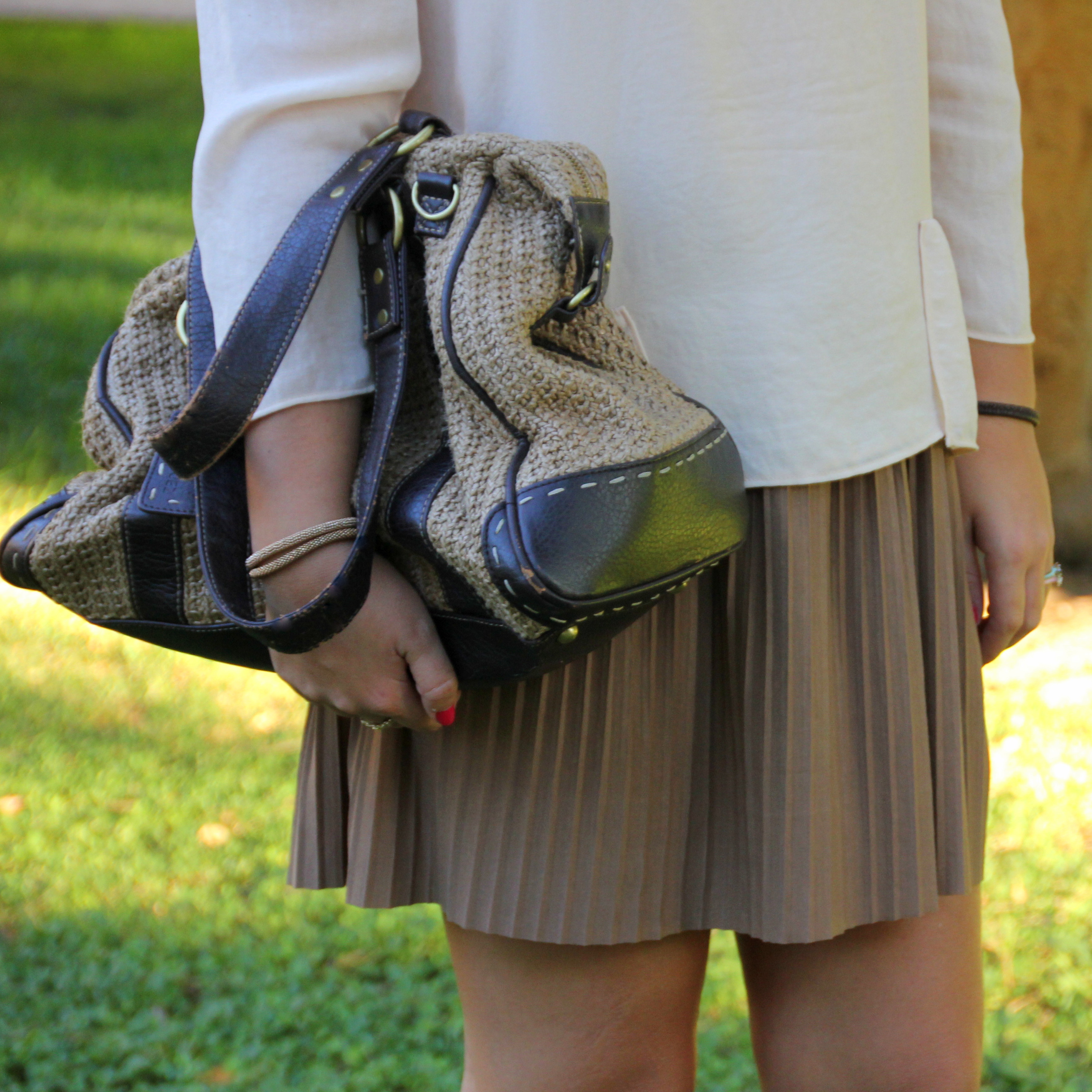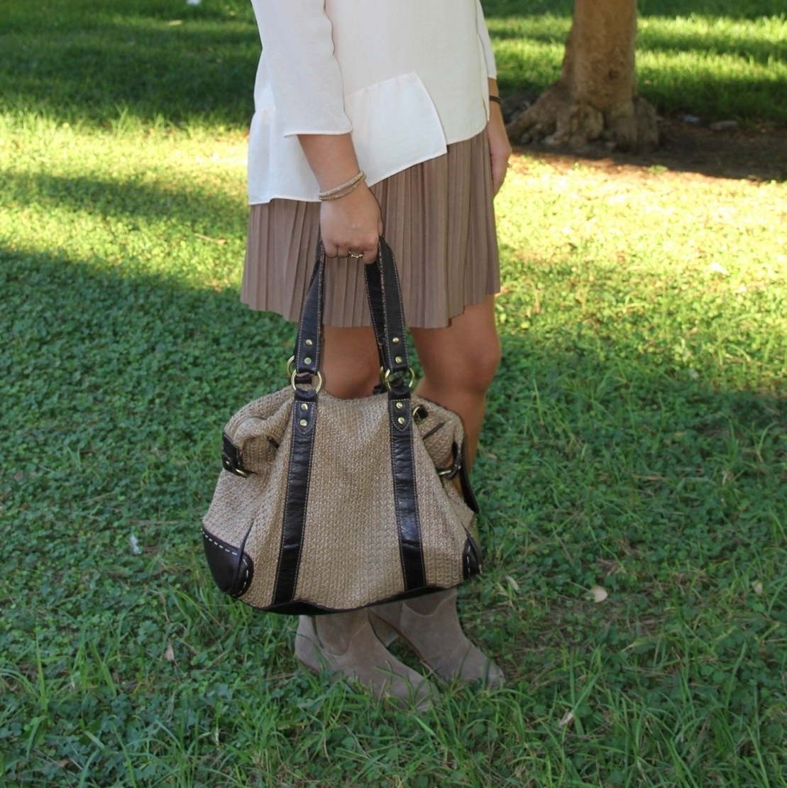Esta blusa es perfecta por su gasa finita, su textura, su color rosa palo y por su vuelo. Es de ZARA. La combino con falda beige de tablas de BLANCO, botín de ante beige de PULL&BEAR y bolso de ADOLFO DOMINGUEZ.