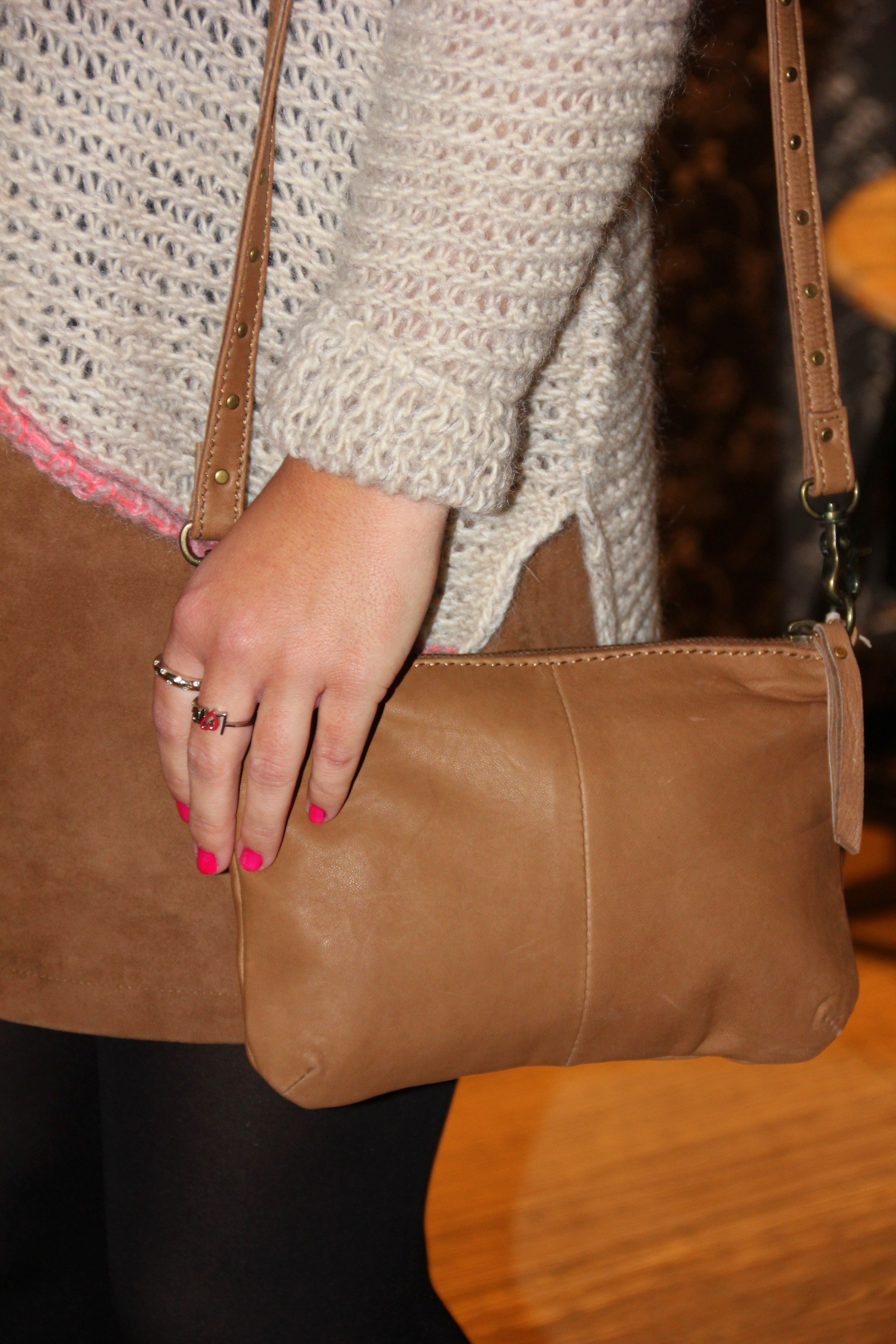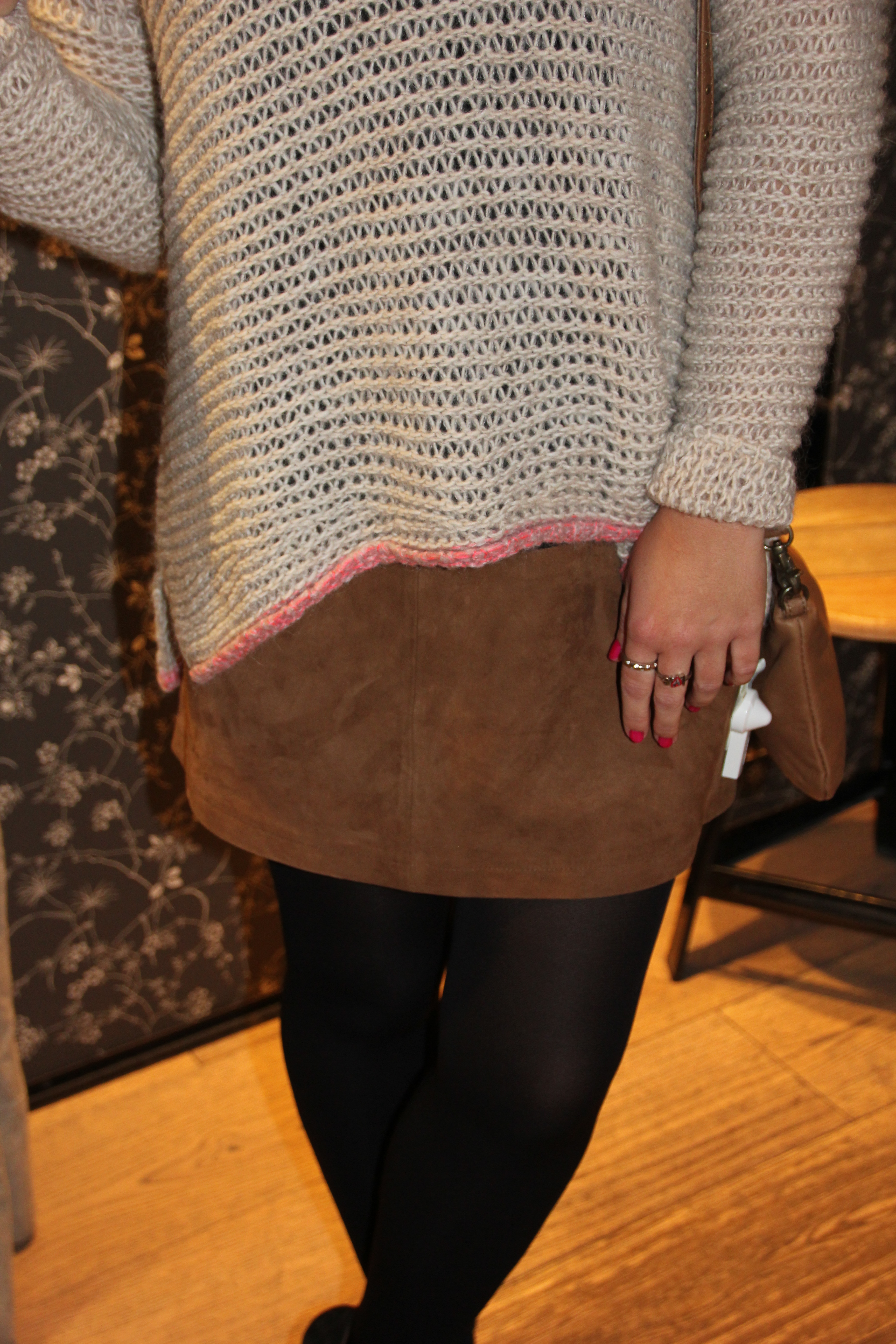 Llevo falda de ante marrón, jersey grueso beige y bandolera marrón.