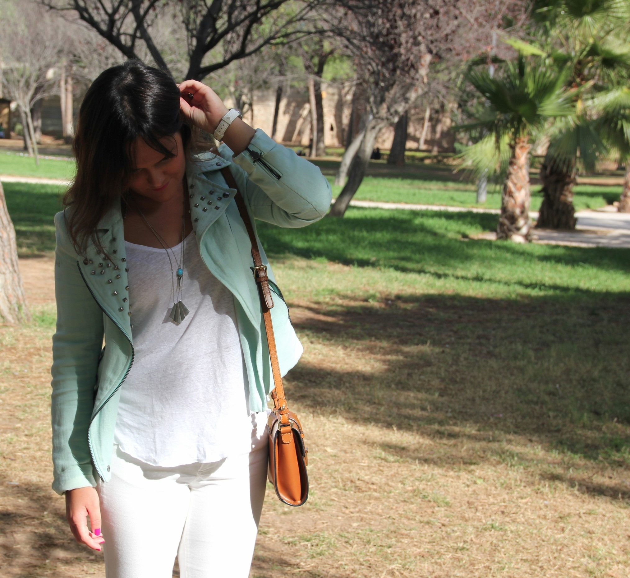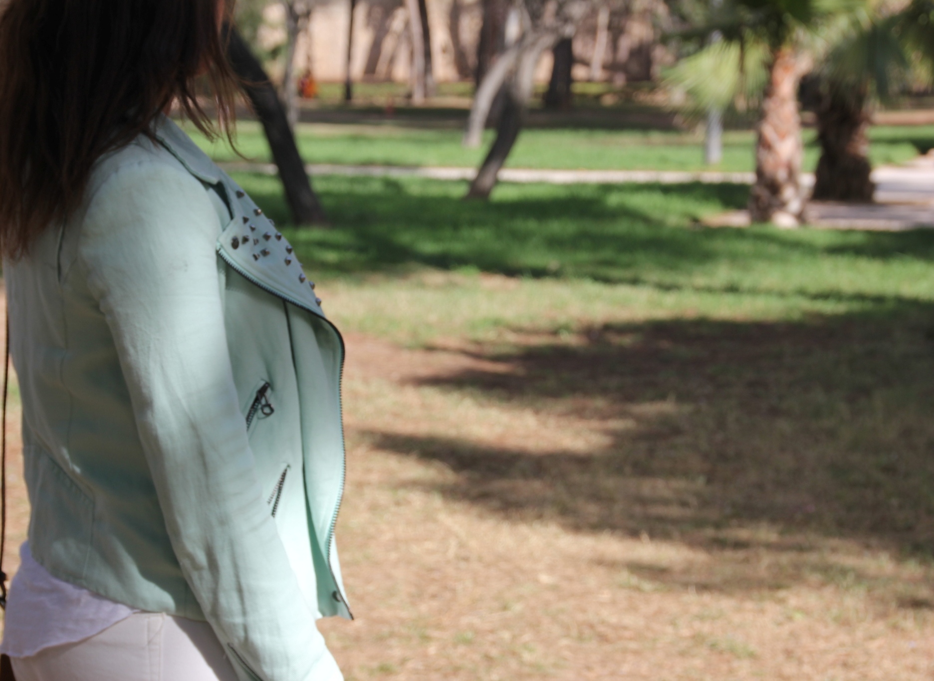 In today’s outfit I’m wearing my favourite jacket with white basic t-shirt and white jeans to give all the importance to the jacket. I love its mint color, it’s cut, it’s sided zip and the studs! What do you think about it?I like how these colours can make relaxed and fresh outfits and besides it’s very fetching! Suelo cansarme muy rápido de los colores de invierno, negro, gris, marrón, granate… por eso de vez en cuando incorporo a mis looks de otoño colores frescos para darle un poco de alegría a esto del vestir. En el look de hoy llevo mi chaqueta favorita con unos vaqueros blancos y una camiseta básica blanca para darle todo el protagonismo a la chaqueta. Me encanta su color menta, el corte, la cremallera cruzada y las tachuelas!! ¿Qué os parece? Me gusta como este color consigue looks relajados y frescos y además es muy favorecedor!