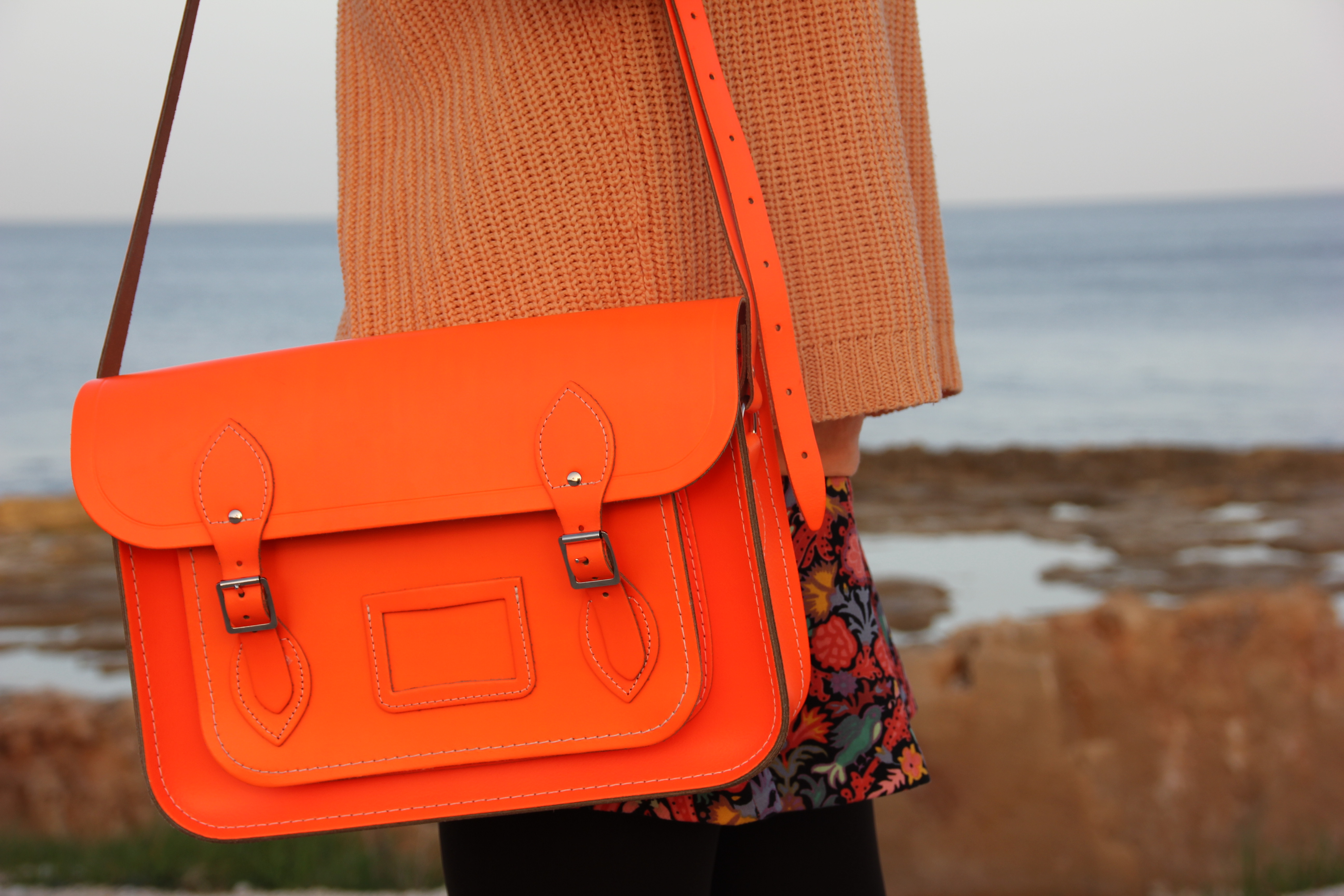Llevo una falda de flores en tonos naranjas, rosa, amarillo, azul y verde, jersey naranja con apertura en la espalda, bolso naranja flúor (mi bolso favorito!!) y botín de ante beige.