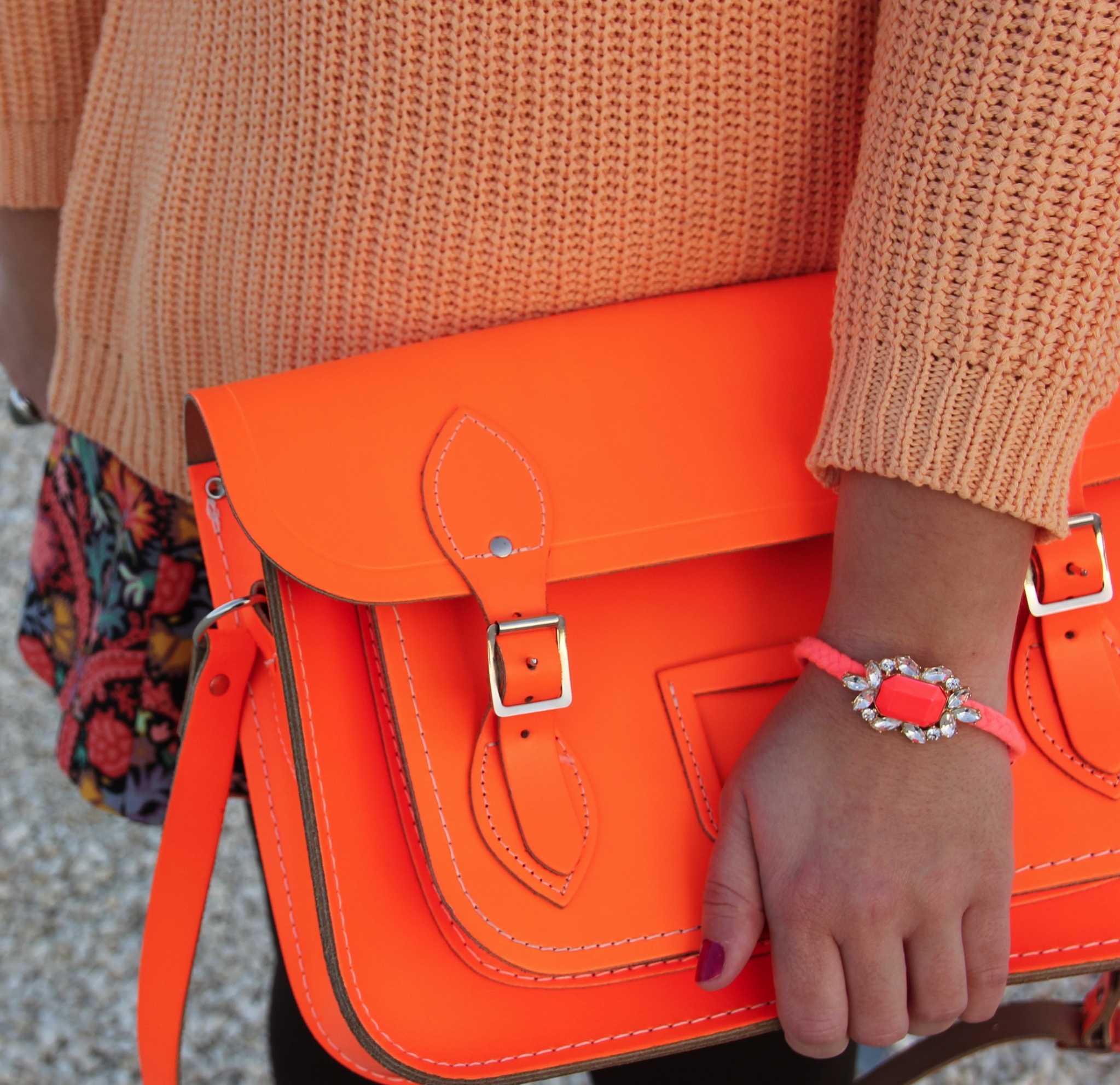 I’m wearing a flower skirt in orange, pink, yellow, blue and green, orange jumper with open back, orange neon bag (my favorite one!) and suede ankle bootie.