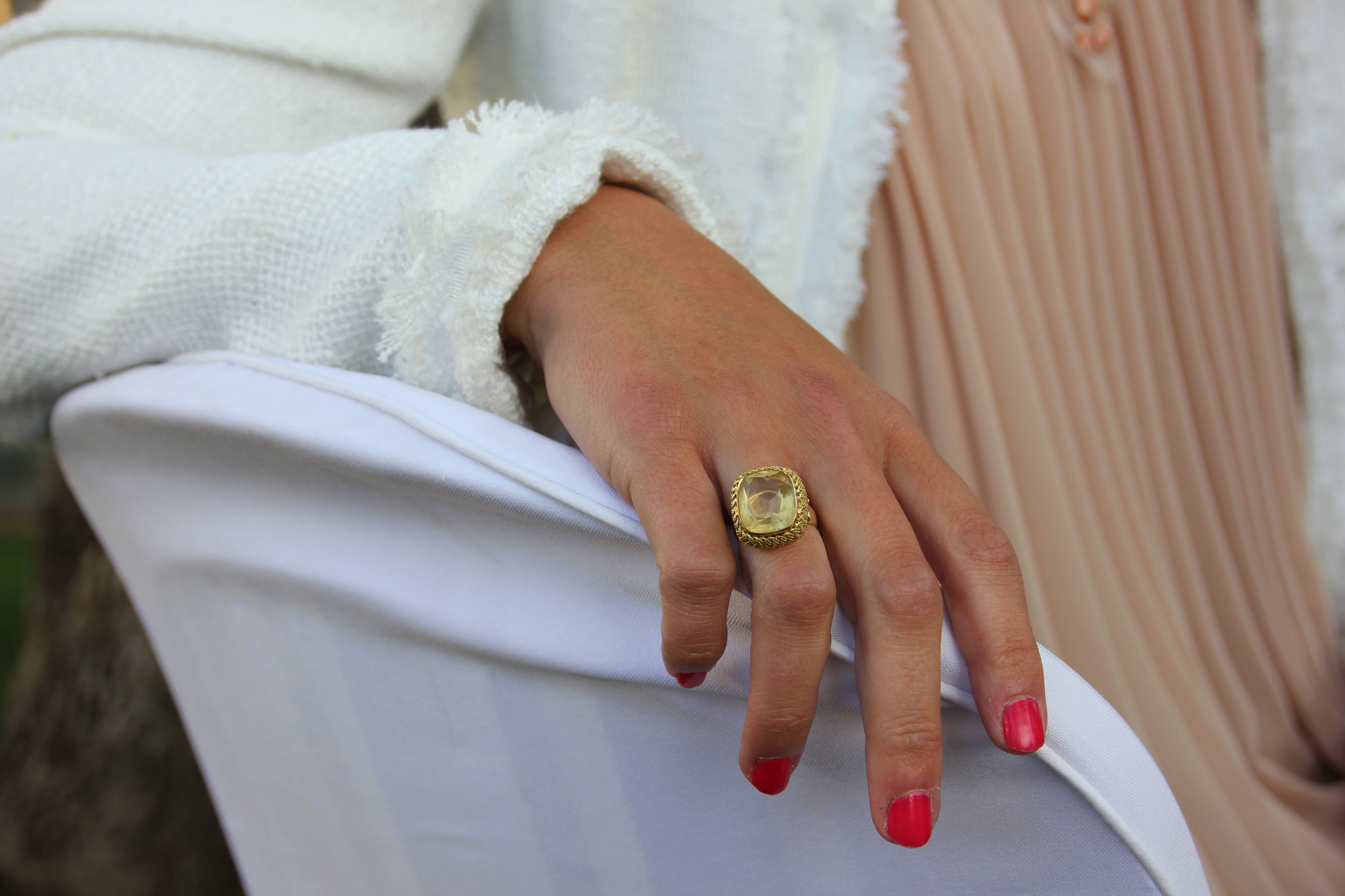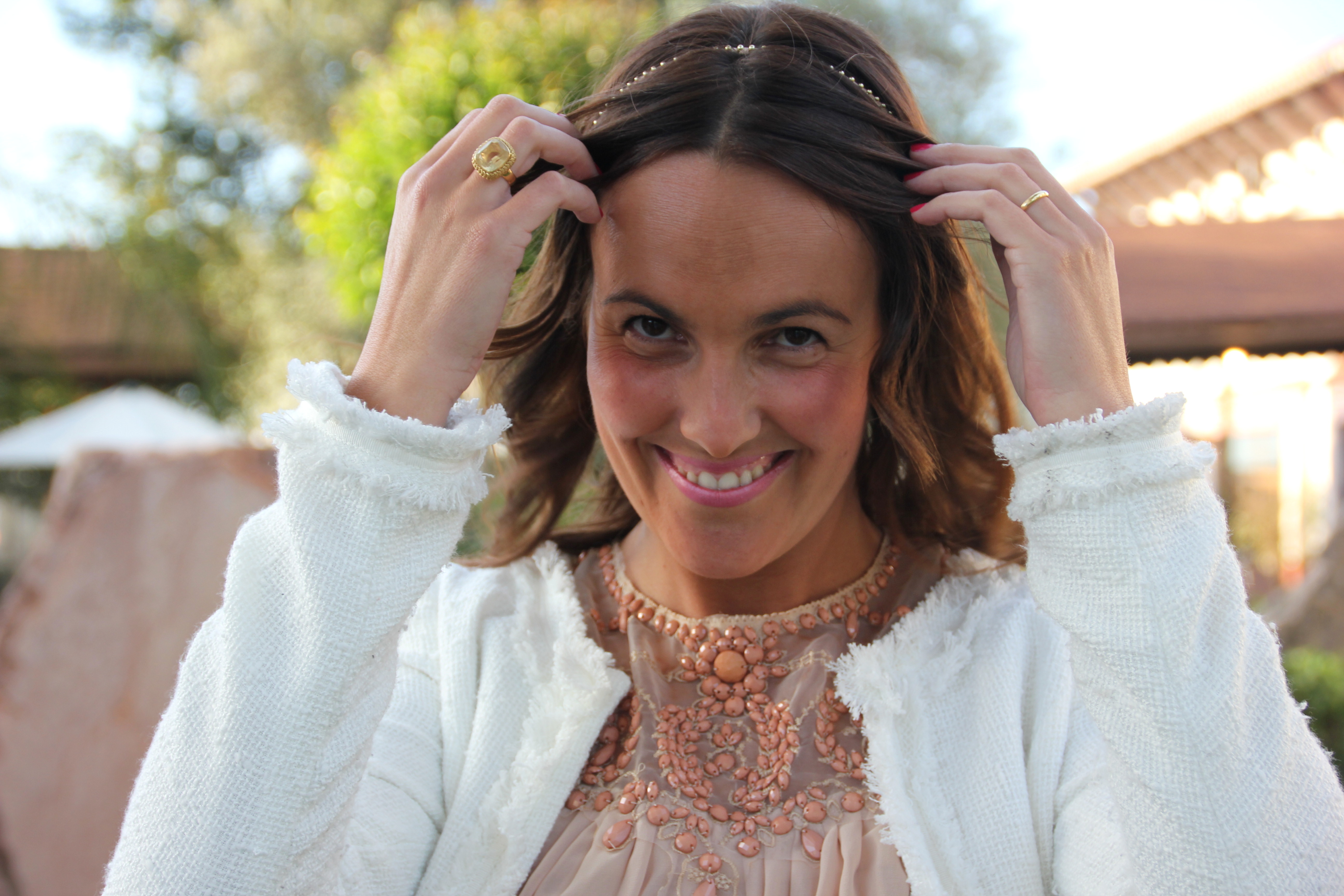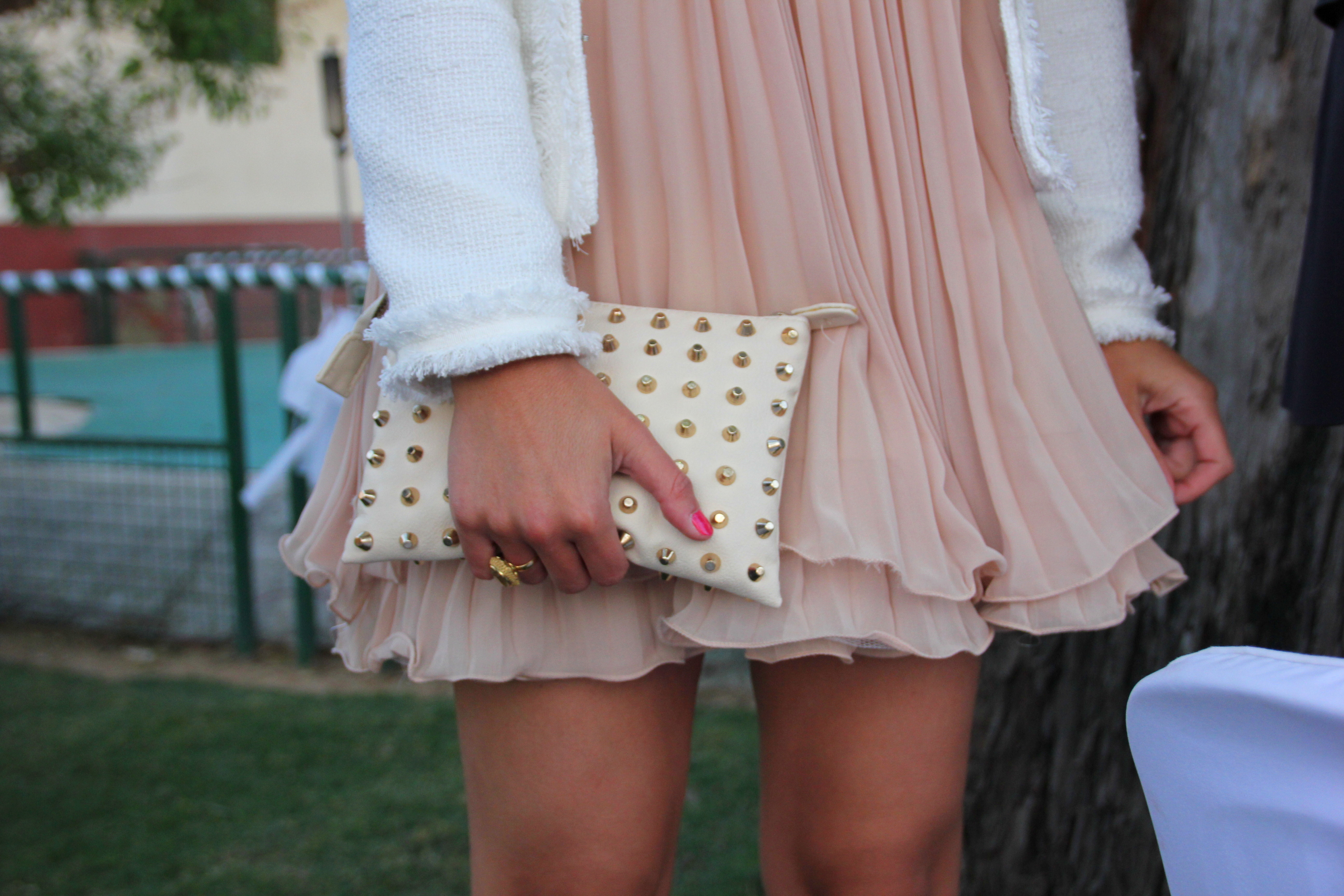 Hoy os traigo un nuevo look de la mano de Paula. Os enseño el outfit de boda que lució. Un vestido 10, su color nude, su forma, su vuelo, absolutamente todo me gusta de este vestido. Lo hemos visto muchísimo por la blogosfera y cada vez lo encuentro más encantador. Decide completar el look con zapatos de tacón color nude, bolso beige con tachuelas y una diadema con mini tachuelas doradas. Como hacía fresquito por la noche, añadío una chaqueta blanca de tweed.