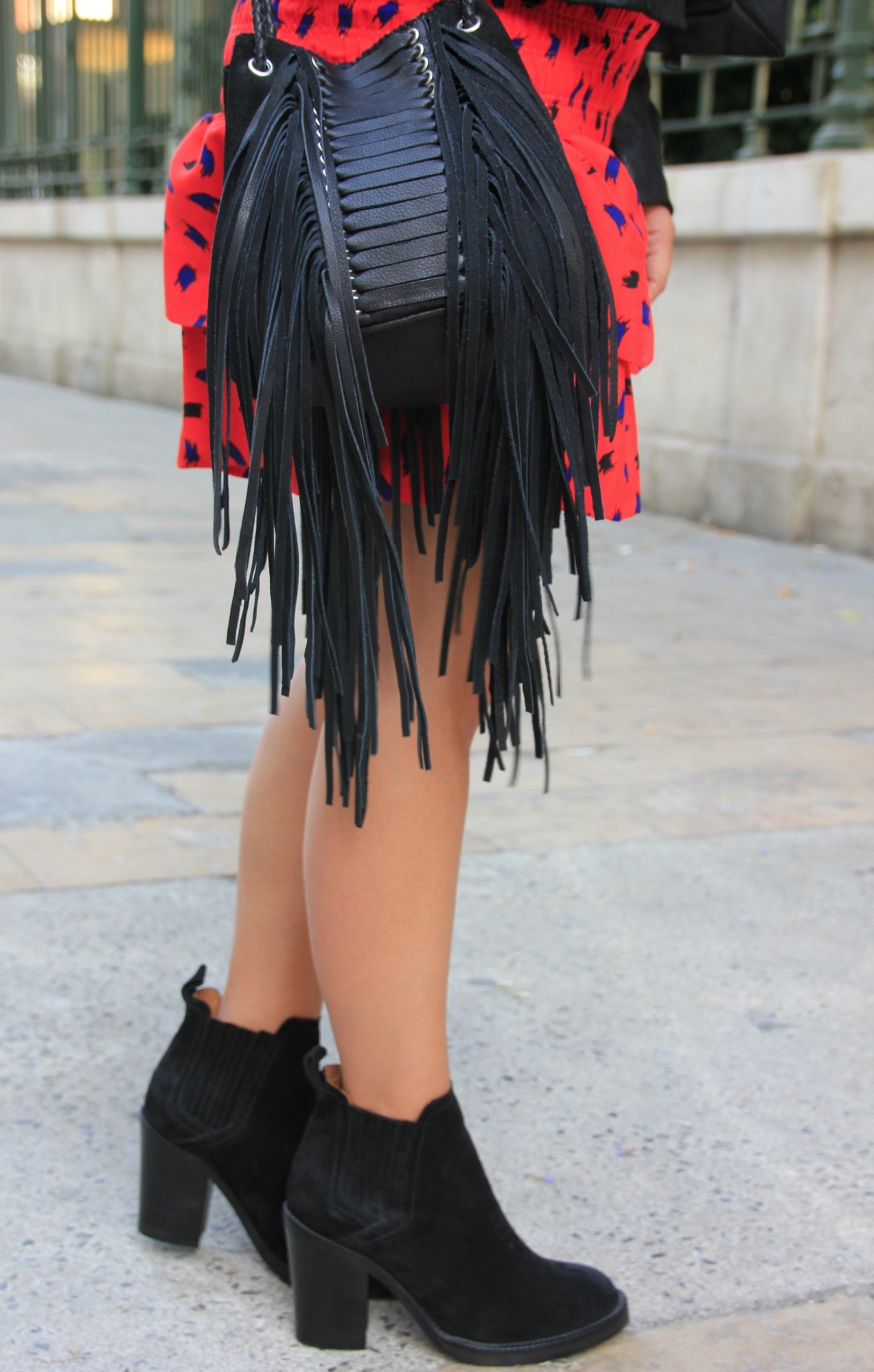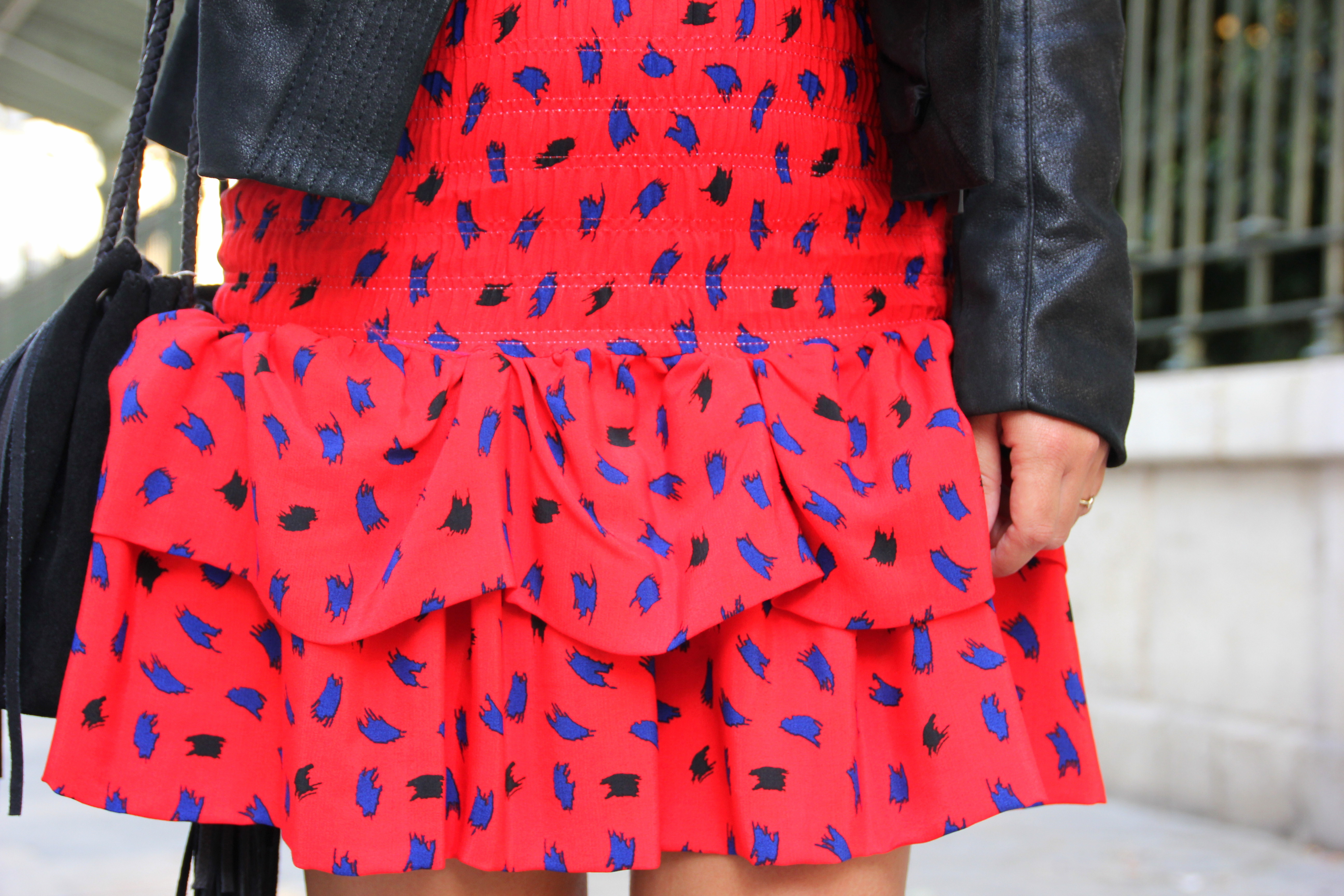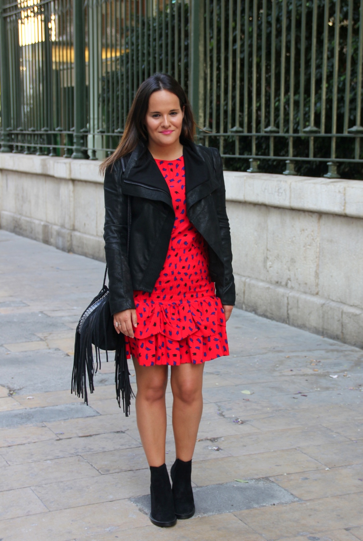 El primer look que os enseño es un total look de la firma MAJE. Un vestido rojo super favorecedor por su corte y los volantes de la falda, con cazadora de piel negra, botines de ante negros y bolso negro con flecos.
