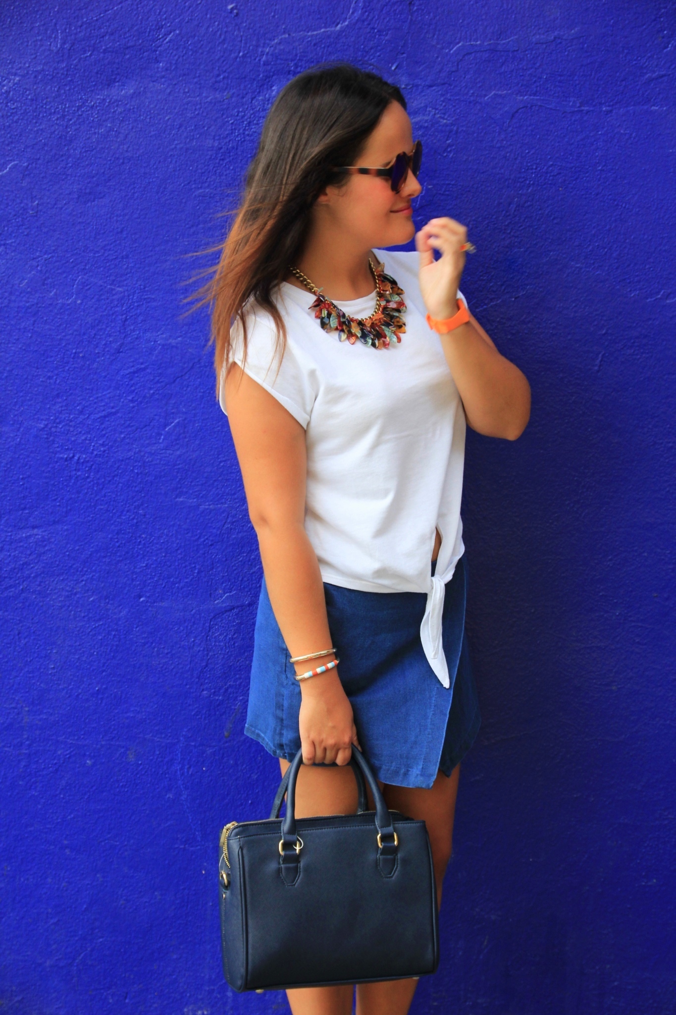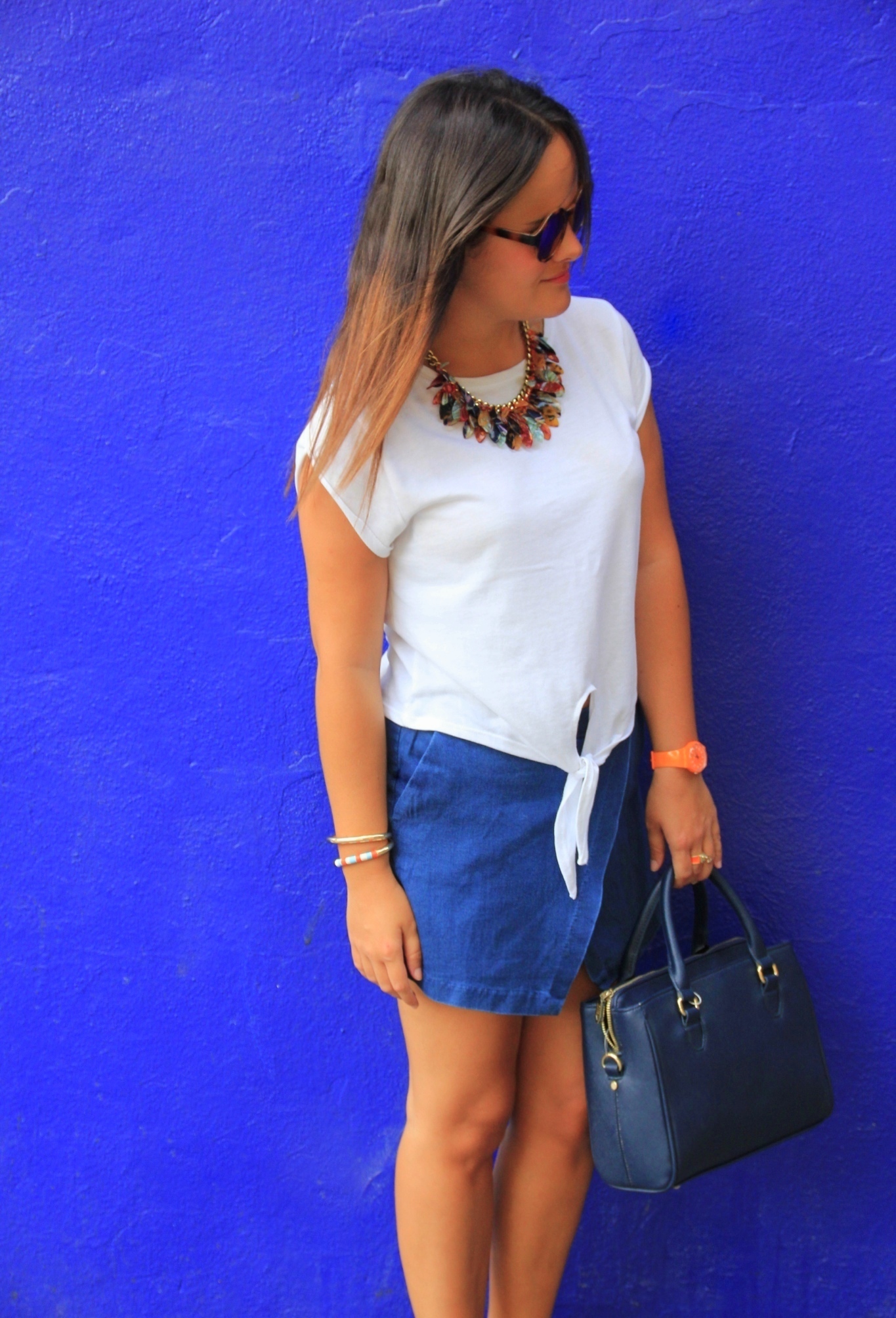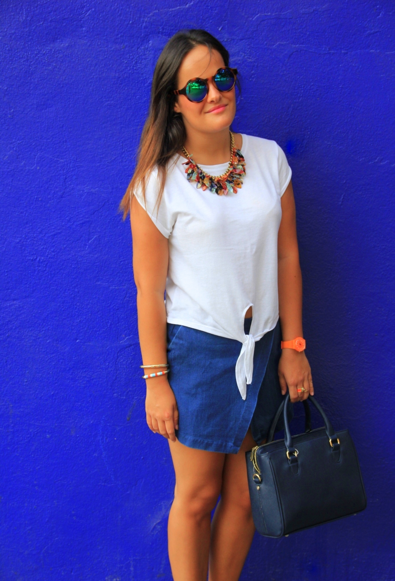 Como complementos, un maxi collar colorido y unas gafas con cristal de espejo que tan de moda están en verano!!