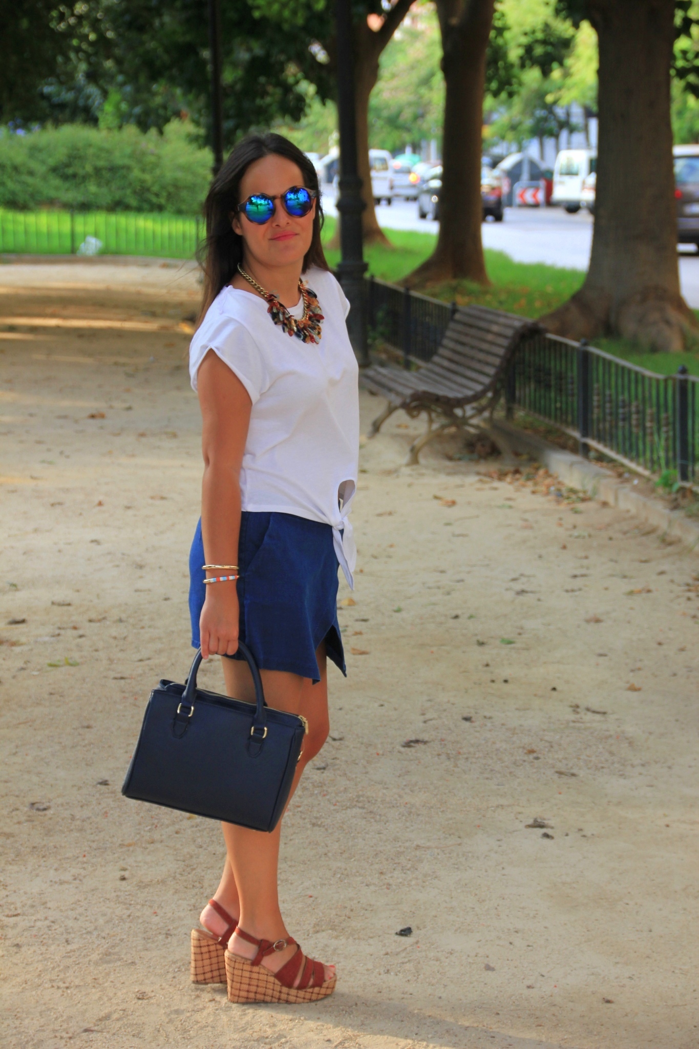 El de hoy compuesto por prendas que para mí son muy especiales. Soy muy fan de la falda pantalón, ya os he enseñado alguna por el blog, aquí y aquí. Esta denim me parece super original y muy ponible, para sustituir a los shorts o faldas vaqueras. La camiseta blanca muy básica pero anudada, la hace diferente. Las cuñas son unas de mis favoritas, comodísimas y con tacón combinado me parecen perfectas para dar un toque distinto a cualquier look.